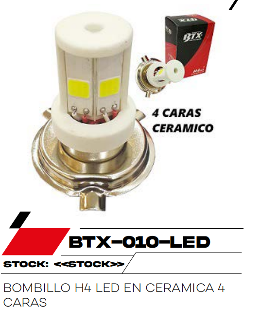 El Bombillo H4 Led 4 Caras Btx es una excelente opción para quienes buscan calidad y rendimiento. Fabricado con materiales duraderos, garantiza un funcionamiento confiable en todo tipo de condiciones. Perfecto para reemplazar piezas desgastadas o mejorar el desempeño de tu motocicleta. En Repuestos de Motos Molina te ofrecemos productos originales y compatibles con las principales marcas del mercado. Compra con confianza y dale a tu moto el cuidado que se merece.